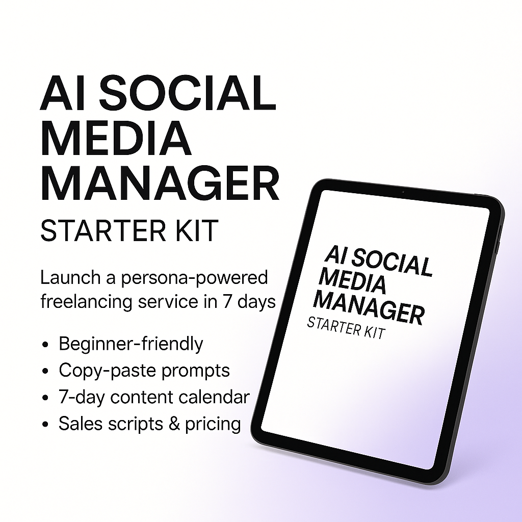 The AI Social Media Manager Starter Kit gives beginners a simple, step-by-step system to plan, write, and deliver on-brand posts using an AI persona. No tech skills required. You’ll generate ideas and captions in minutes, add a human edit, and hand off polished deliverables clients love.
